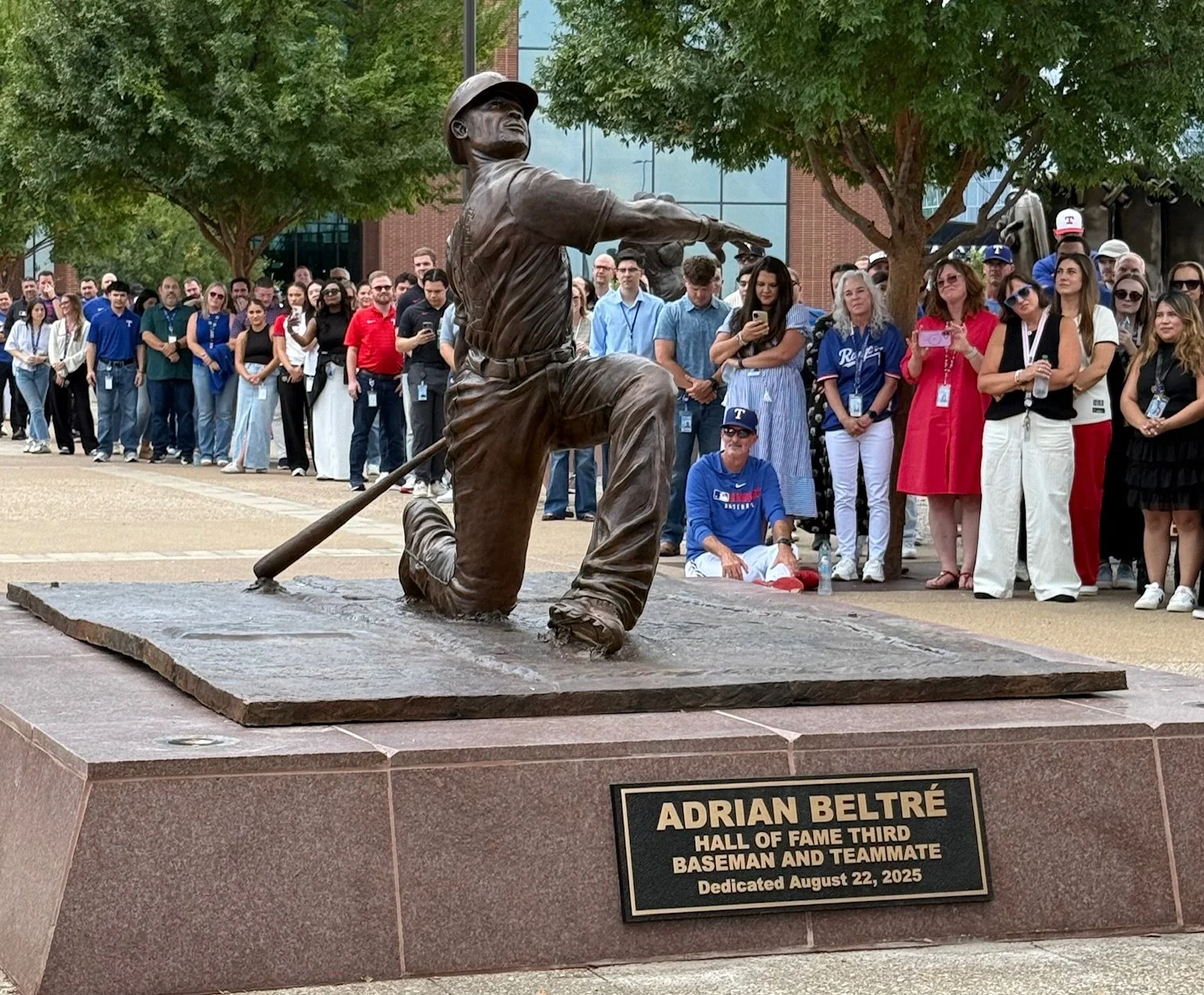 The sculpture depicts Beltré’s iconic one-knee swing, a pose personally selected by the honoree and recognized as a defining moment of his career. Beltré played for the Rangers from 2011–2018, contributing to back-to-back World Series appearances and earning multiple All-Star selections, Gold Gloves, and MVP finishes before his induction into both the Texas Rangers Hall of Fame and the National Baseball Hall of Fame.